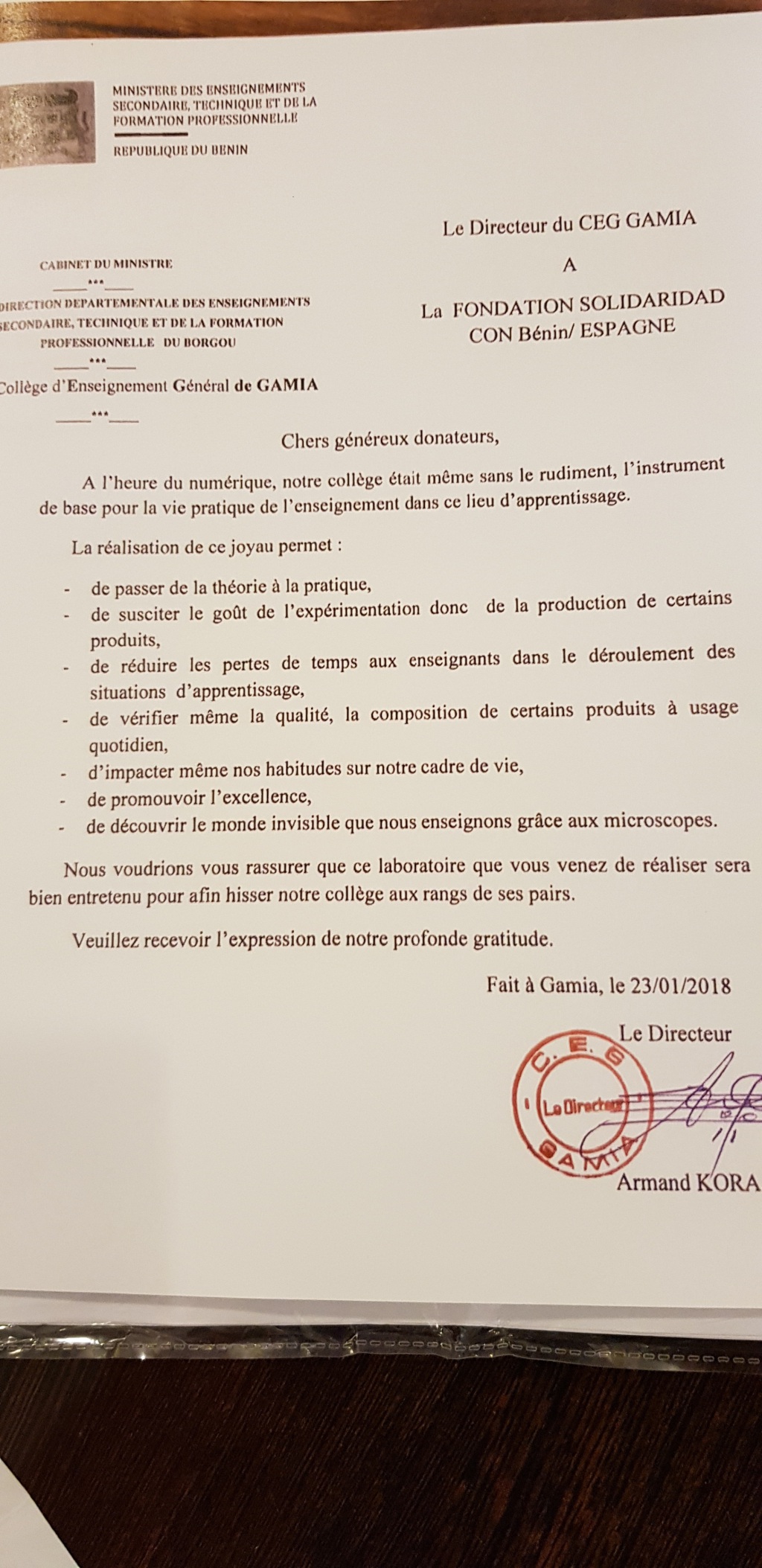 En Benin, la educación de primaria es gratuita, sin embargo, la educación secundaria únicamente es gratuita en el primer ciclo para las chicas. El primer ciclo para chicos y el segundo ciclo en su totalidad son costeados íntegramente por los padres. Pero más allá de los costes de los estudios, se encuentra la dificultad de los alumnos de ciencias. Para poder graduarse es necesario superar el periodo de prácticas de laboratorio del segundo ciclo, sin embargo, el instituto no cuenta con laboratorio. La Asociación de padres conocedores de este impedimento donó un solar anexo al instituto, pero ahora hace falta su construcción y equipamiento (adjuntamos copia). Sin este laboratorio, los alumnos que deseen continuar con sus estudios tienen que desplazarse a Bembereke, a 16 km. Esta distancia que para nosotros es casi insignificante, para los alumnos de Gamia significa abandonar los estudios, ya que nadie cuenta con medio de transporte y muy pocos pueden desplazarse el curso escolar a esta localidad, ya que tendrían que quedarse todo el curso en Bembereke en un internado, residencia o como es habitual en las chicas, sirviendo en otras casas.
